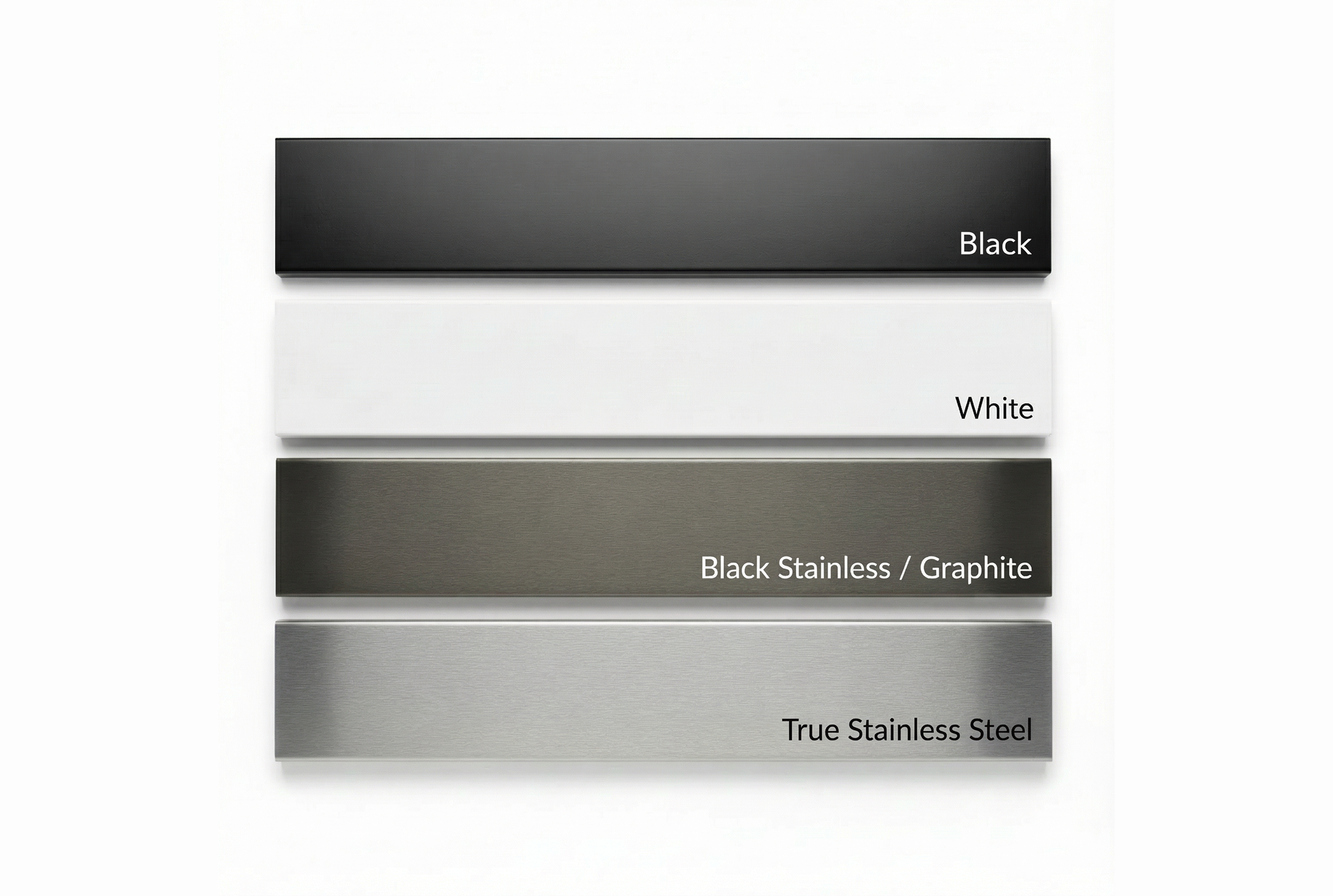 We offer stainless steel, black, white, and black stainless (graphite). Samples available upon request.